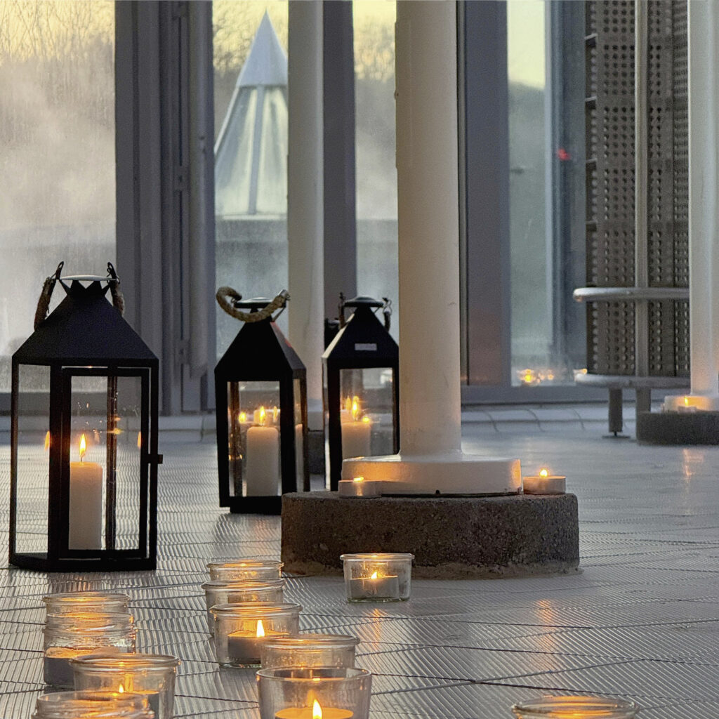 In der kühlen Jahreszeit wärme dich mit den unzähligen Kerzenflammen beim Kerzenscheinschwimmen nach dem sportlichen Wandern wieder auf.