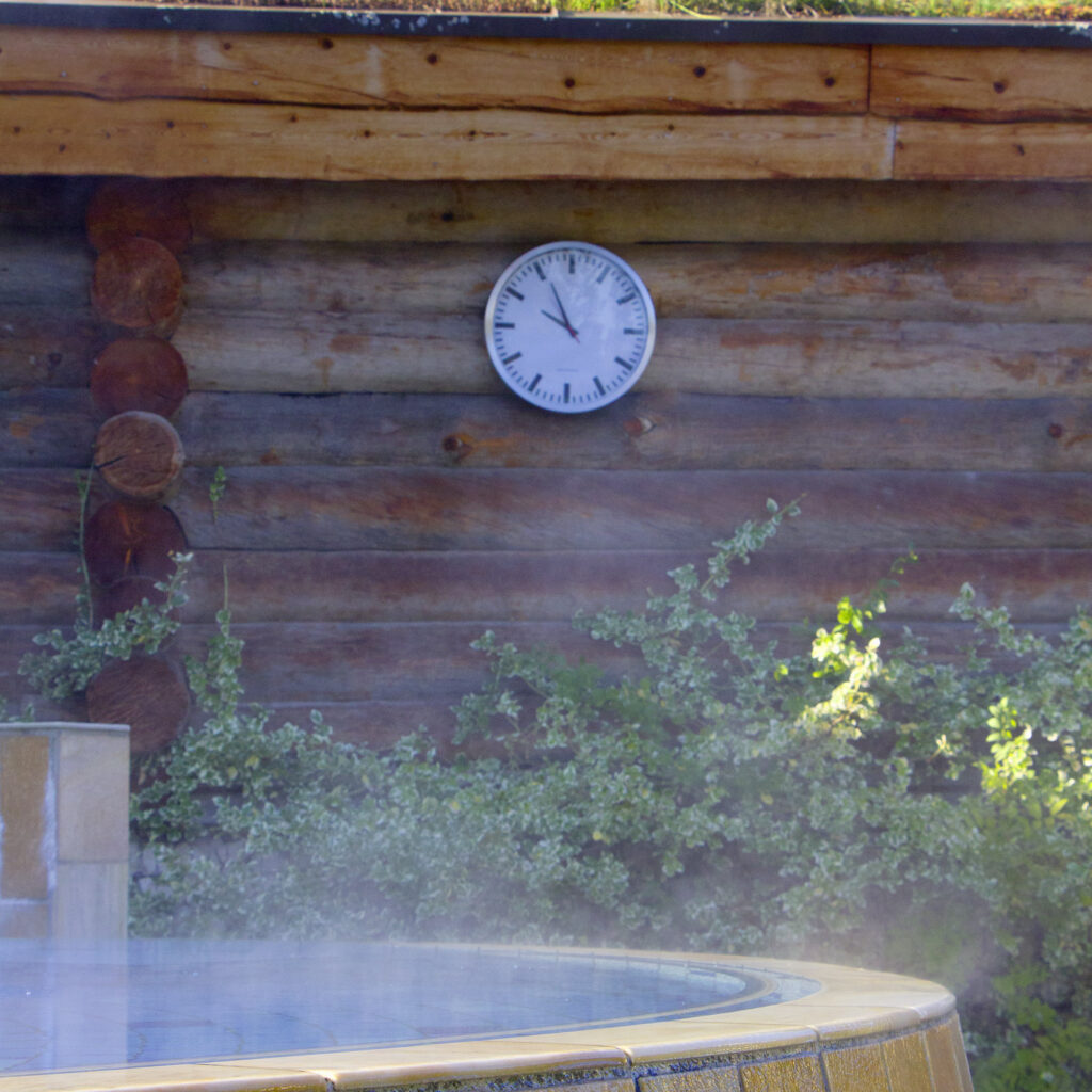 der Sauna mit Panoramablick auf Wiesen, Felder und Wälder