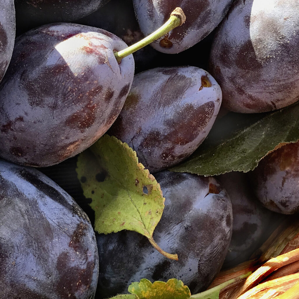 „Zu grosser Kern, zu wenig Fruchtfleisch!“ Sagt er und erntet exklusiv Haferschlehen (Prunus domestica subst. Insititia) mit viel mehr Frucht und maischt diese ein.