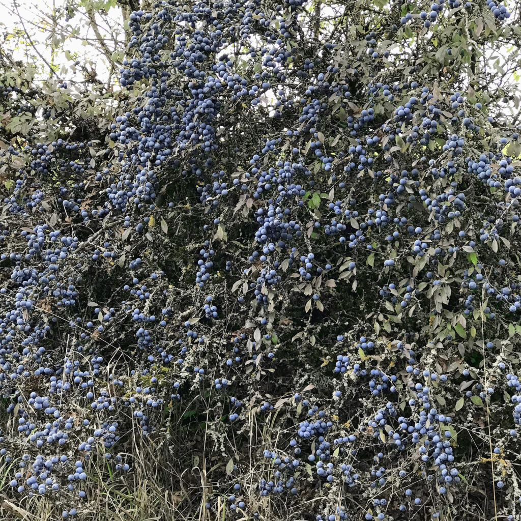 Seine Erfahrung und sein Wissen über Wildfrüchte und ihre Reife wird da fast zur Geheimwaffe. Heuer weigert er sich, die Büsche abzuernten, die wir beim Wandern in der Natur bestaunen: Den normalen Schlehdorn (Prunus Espinosa), der vor Unmengen an Früchten fast wie blaue Tücher an den Feldrainen weht.