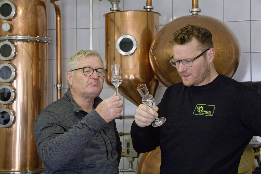 Axel und Hendrik in Gemünda sorgen dafür, dass nicht nur Schlehen hochprozentig in Flaschen kommen, munden, erwärmen und fröhlich machen.